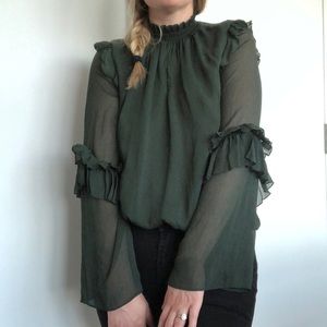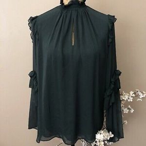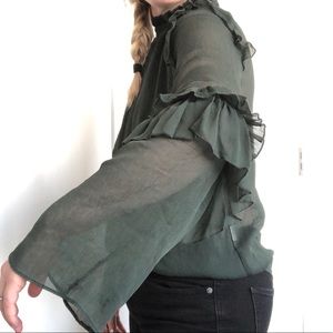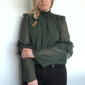 Zara blouse with gorgeous high neck detail and ruffle on trumpet sleeves. Very forgiving and elastic at neck. Sheer detailing in the back, but front is completely opaque with lining. Very cute key hole details in front! Very gently worn.