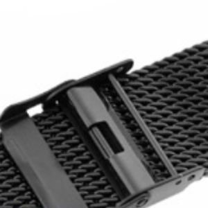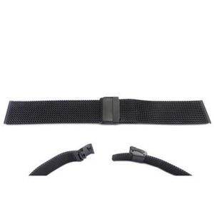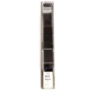 Hadley Roma manufactured this universal replacement band for Men’s dress watches. The basic black bracelet features a mesh link design, which provides more flexibility than traditional metal straps. This style creates a relaxed fit while maintaining a light weight. A brushed finish softens this eye-catching accessory while the sliding clasp allows for comfortable fit.