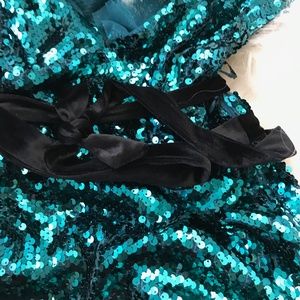 Make a statement in this sequin embellished mini dress featuring contrast velvet waist belt.
