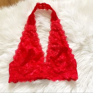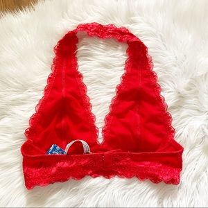 Stretchy and soft, this lace halter bralette exudes sultry appeal with a plunging neckline, mesh lining, and scalloped trim. This lavish piece is not only fashion-savvy, it's functionally equipped with support without an underwire.
