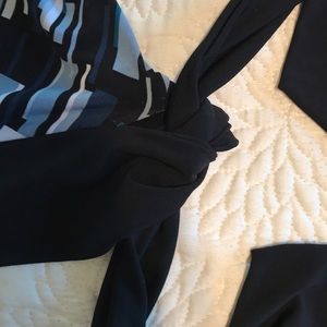 Black, blue, and white mosaic pattern with low V, ruched V edges, elastic neck strap, and fabric side tie detail. Versitile and classy: A jacket or wrap could make it business appropriate- then you’re ready for happy hour after losing the coverup!