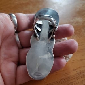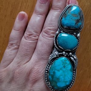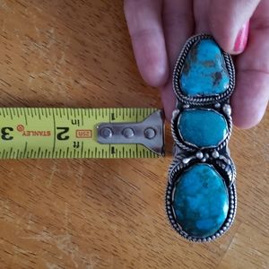 this is a whopper of a ring weighing in at over 48 grams on my scale. it is a long hefty ring unmarked but when i purchased it way back when i was told it was sterling silver and bisbee turquoise from a reputable jeweler. it has 3 beautiful stones natural inclusions and veining purplish brown colors and blues and greens. this is a magnificent piece .please let me know if you have questions.