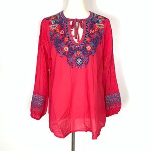 NWT. Gorgeous embroidered neckline detail and sleeve trim. V-neck with button and tie detail. Machine washable.