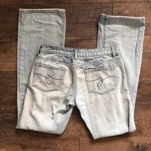 Lightly used adorable light wash bootcut jeans. Soft jean material - super comfy! Light blue embroidery above back pockets.