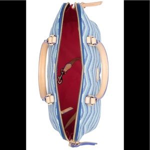 NWT MSRP $238 Dooney And Bourke Zip Zip Chevron Satchel Handbag Blue Multi. Condition is New with tags. Chevron fabric, extended two-way zipper, detachable adjustable strap, dual top handles, metal feet for protection, PVC coated cotton exterior, textile lining. One inner zip wall pocket, cell phone pocket, key hook, and slip wall pocket. 9.5” H x 12” W x 5.25 D. 4” handle drop. 12-15.5” strap drop.