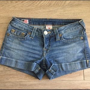 True Religion Allie Denim Shorts, light wash, cuffed at the bottom, very comfortable and true to size. 2.5” inseam. 98% cotton, 2% spandex. Worn a few times, great condition.