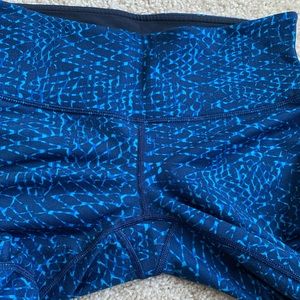 Navy blue & light blue print leggings for working out or hanging out. Have not been altered in length. One key pocket on front waist band. Gusset in crotch to prevent camel toe. Logo on back reflects light if you’re out late. In great condition.