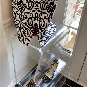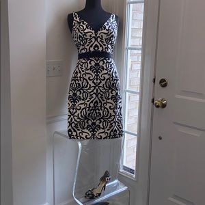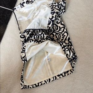 Black & cream cotton e. Spaghetti straps. v-neckline. Fitted waistline. Above knee w. Rear vented hemline. Fully non shifting lining. Straight cut cEUC
