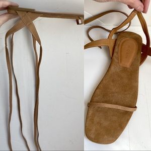 Doen genuine leather sandals with boho minimal look thin straps. One single strap w super long straps to wrap up leg like ballerina point shoes.