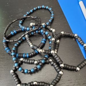 3 black and blue, 3 black and silver and 1 black set of stretch bracelets.