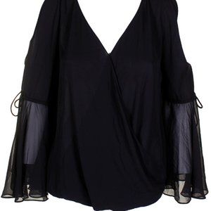 INC INTERNATIONAL CONCEPTS M Shirt Black Faux Wrap Blouse Sheer Anna Sui Cold Shoulder