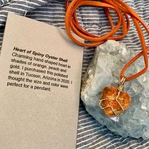 Luscious orange heart of natural shell wrapped in 14K gold fill wire by me. Great pop of color to wear as it as activates and enhances our creativity🧡Strung on a long (30”) matching orange suede cord. Very lightweight, this thin profile pendant is easy to pop on - looks great on a tee shirt/sweater as well as a silk blouse❣️