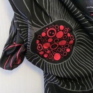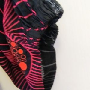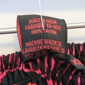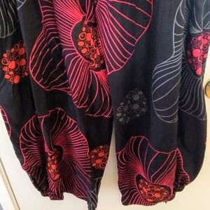 Inset flat front waist with elasticised back, side slash pockets, and elasticised hem. 100% Rayon, machine wash cold. New condition. Waist 36", Rise 11", and Inseam 27". Measurements are approximate. Black with red, pink, blue, grey, & orange print.