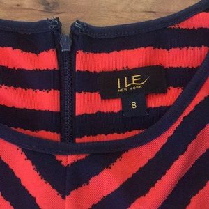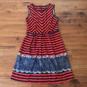 I LE New York size 8 belted fit & flare dress. Navy blue and red orange chevron and striped pattern with navy blue and white floral design. Back zip closure.