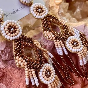 Absolutely beautiful beaded tassel chandeliers by jewelry designer Deepa Gurnani, whose work is often featured by Anthropologie. Tribal in appearance, they look almost Native American. Sensual, light as a feather, guaranteed to draw compliments whenever you wear them. Designed by Deepa & handmade according to her specifications by jewelry artisans in India. Handcrafted with delicate glass beads, vegan leather backing & post backs. Approx. 3 3/4” long, 1” wide. NWT 🌷