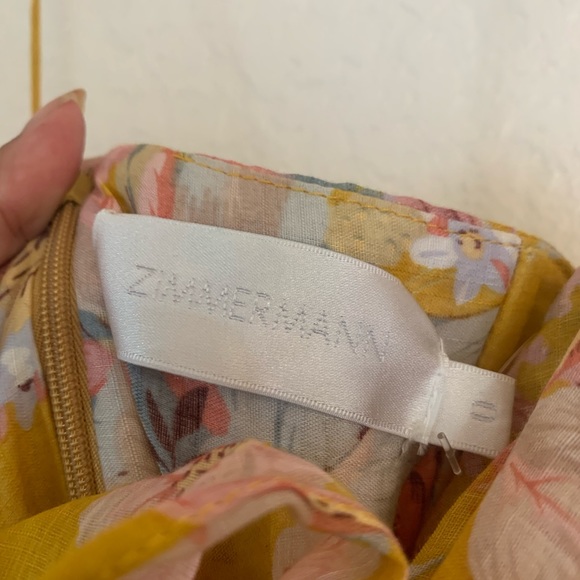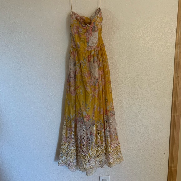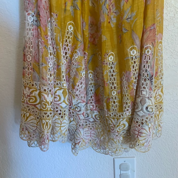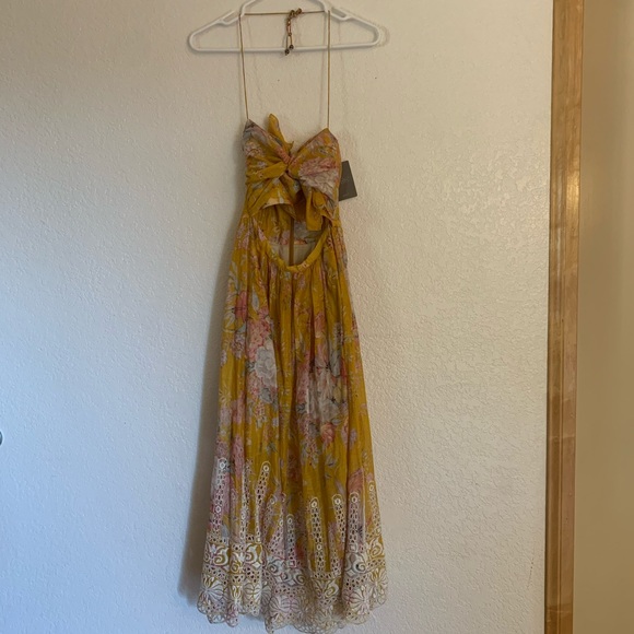Zimmerman dress size 0. On the Zimmerman website it says a 0 is a US 2-4. Sold out everywhere. New with tags. Has a tie neck line with cutouts and beautiful crochet style detailing on the bottom. Perfect for a wedding or formal party. As seen on Selena Gomez.