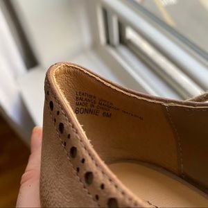 Features: Oxford/wingtip style, color is a taupe/beige/tan, stacked block heel, closed toe