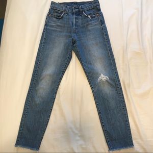 - high waisted, raw hem, tapered leg, knee rip on left leg, button fly
