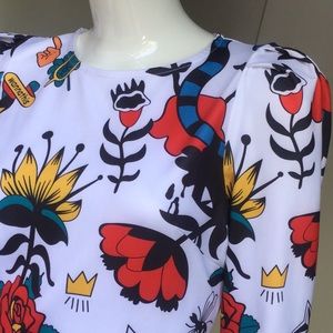 Unique playful print mid-thigh dress. Back zipper to waist. Easy on. Lovely gather at shoulder.