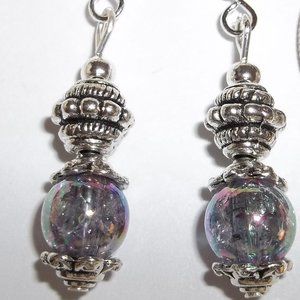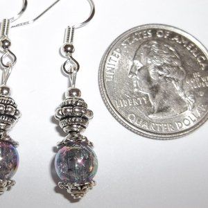 Done with purple AB glass beads and silver toned costume jewelry antiqued metal beads. The AB purple beads have an iridescent shimmery look to them. They flash the metallic colors of purples, blues, yellows, oranges, and greens in the light. Very-eye catching! The pair dangle & drop from 925 sterling silver french fish hook ear wire style backs for women's pierced ears. 1 3/4 inches long and not quite 3/8 inch wide. Each single earring weighs approximately 2.0 grams. Lightweight!