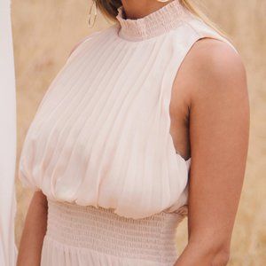 A woven dress midi dress featuring allover accordian-pleated construction, a smocked high neckline, wide smocked waistband, keyhole back with button loop closure, woven lining, and a flowy A-line silhouette.