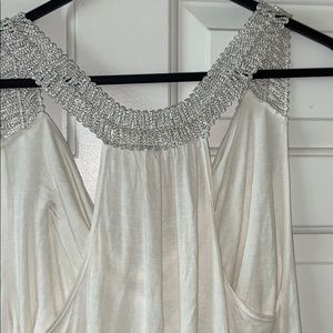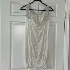 BRAND NEW WITH TAGS PAPAYA brand gorgeous tank top, tunic or top In white with some unique and fun shoulder straps. They are touched with silver sparkles that also go across the back. It measures 19” from armpit to armpit and 32” in length. Size large.