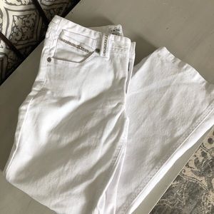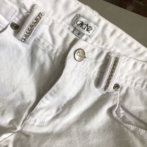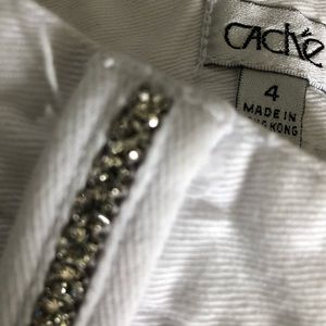 This is a fun & sexy pair of white embellished jeans by CACHE’ ankle length , rhinestones along pockets , back and front , and on belt loops, .size 4 , perfect for beach days or summer nights