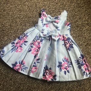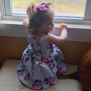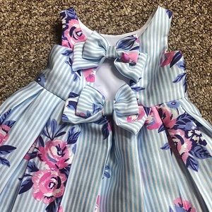 Adorable Cynthia Rowley floral dress with blue and white stripes. Has matching purse and adorable bows on the back. Only worn once for a few hours, no stains, EUC