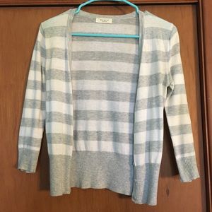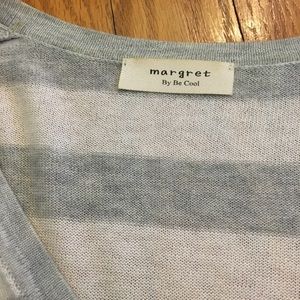 White and gray striped sweater cardigan with buttons. Worn but good condition. “Margret by Be Cool”. Soft and thin material. Great for spring!