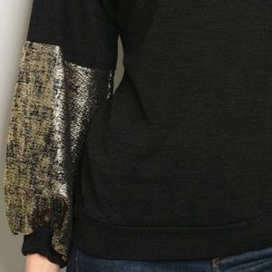 Cute black and gold sleeves slub knit top. Poly and spandex. Model is wearing size small.