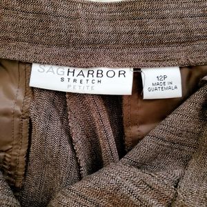 π€ Sag Harbor brand brown slacks tweed style with thin black pinstripes. Stretch material. Tag says size **** 12P **** , however they have been professionally tailored to a size **** 8/10P **** waist. Gently worn, flawless GREAT condition. Please refer to the photos for measurements and care tag.