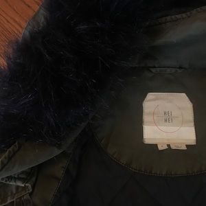 HEI HEI Richmond green anorak jacket for Anthropologie. Insulated, so it can easily transition from fall to winter. Hood. Four front pockets, two zip and two snap close. Tie at waist and bottom hem. Extra button included. No flaws, like new condition.