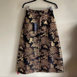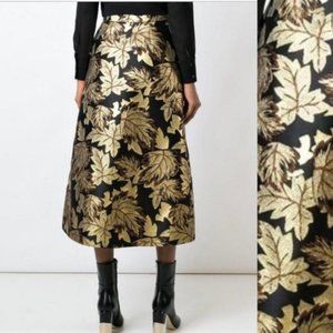 Black, brown and gold silk and wool blend floral embroidered skirt from Saint Laurent featuring a high waist, a button fastening, an a-line shape, a straight hem and a mid-calf length.