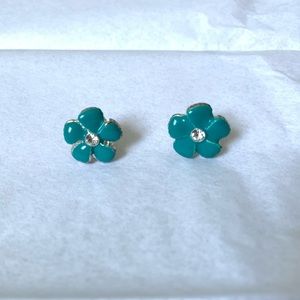 Earrings and necklace turquoise set! Pair of beautiful earrings with silver detailing and silver stone in middle. Silver chain necklace with functioning clasp and turquoise flower pendant with silver stone in middle.