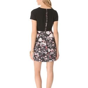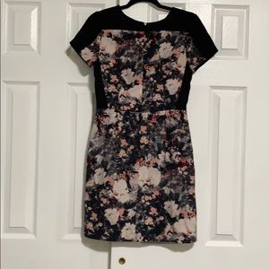 Polyester, crepe texture, lined, two side pockets, zipper closure, crewneck, darts on bodice, pleats on skirt, color blocked design, 30” bust, 28” waist, 6” sleeves, 34” length, in great condition