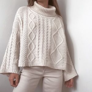 - Chunky cableknit, cowl neck, bell sleeves, boxy fit