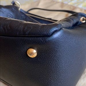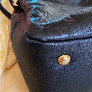 Empreinte leather Louis Vuitton Ponthieu MM with brass hardware, dual flat shoulder straps, canvas lining, four slit pockets at interior walls and zip closure at top. Includes box and dust bag