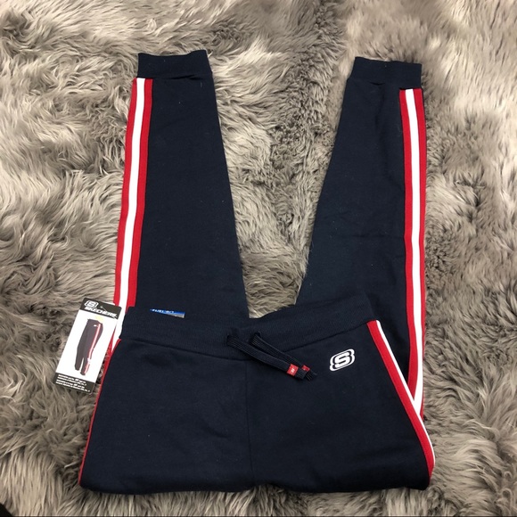 Kid’s Skechers Jogger Pants Size L (10-12) Cuffed ankles Navy with White and Red stripes Drawstrings Elastic waistband Sketchers logo on left leg Composition: 60% cotton, 40% polyester Measurements taken laying flat from side to side: Waist: 32cm Inseam: 63cm Machine wash cold with like colours