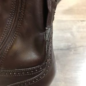 Etienne Aigner Harley brown, vegan leather zip-up boots in size 7 1/2M. Good condition, barely worn but does have some slight cracking/peeling in the leather on the back of the right boot (see last two photos). Comes with original box and from smoke-free environment 🌸