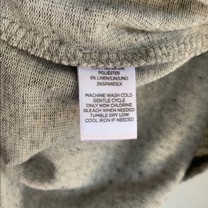 This is a lightweight dolman sleeve sweater from LOFT, size SP. In a marled gray, it features a hi-lo hemline, center seam in back and long sleeves. This loose-fit garment is a polyester/linen blend with a touch of spandex.