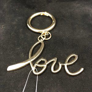 Gold Tone Love bag charm with the L in the shape of the breast cancer ribbon