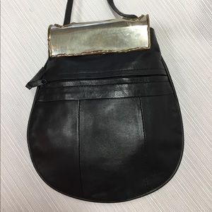 I Ship Fast. Fun Black Leather Bag with Metal Zebra Top that Slides up to open. Metal top is very light weight and easy to slide up. Has Zipper in Back of Bag. Height is 8”. Width across front of Bag is 7.25”. Strap is 48” & 3/8” wide. Very Good Condition.