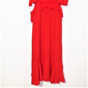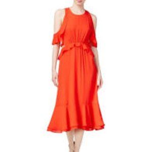 This is a gorgeous midi dress featuring a round neck, cold shoulder with ruffle detail on sleeves, back & hem, peplum waist, waist cutouts, 3-button keyhole and lower zip closure at back.