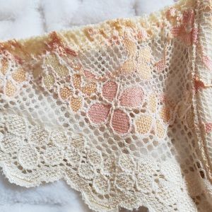 This demure set speaks RETRO / Vintage inspired lingerie. Sweet, two-toned stretch lace Lined cut & sewn Underwire Bra and matching Thong (tanga). Lower cups are lined for shaping and lift. Top cups are sheer two-toned embroidered stretch lace. Adjustable twin straps and pretty bow accent on center of bra and tanga. Scalloped lace on bottom of bra band and waistband/legs and back of tanga. Cotton lined gusset. PEACH Sorbet w/peach & pink/apricot embroidered lace Thong size is S (can fit M)