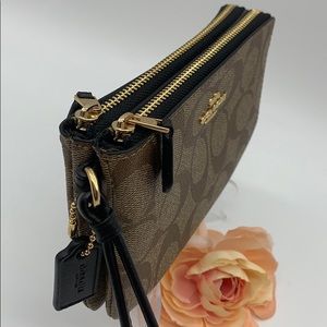 NWT authentic COACH Double Zip Wallet In Signature Canvas Khaki/Black/Imitation Gold Signature coated canvas Six credit card slots Full-length bill compartment Inside open pockets Double zip closure, fabric lining Wrist strap attached 6 1/2" (L) x 4 1/2" (H) x 1 1/4" (W) Style No. F87591