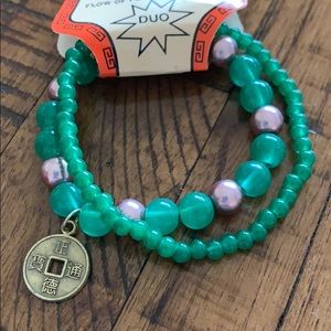 NWT feng shui energy green with pink beads on one bracelet. All green on other. 2 bracelet set. Stretchy. Hanging metal coin.