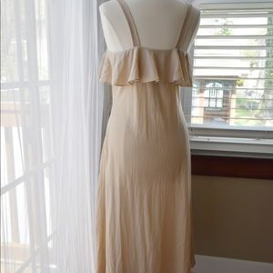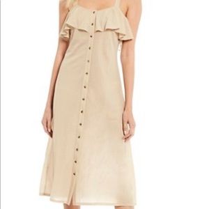 Brand new, adorable knit midi dress! Button front w/ ruffle detail. Photos show armpit to armpit for each size available, small, medium and XL. (16.5, 17.5, 19.5). Tan in color. Not much stretch to the material.