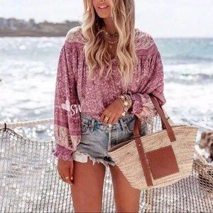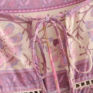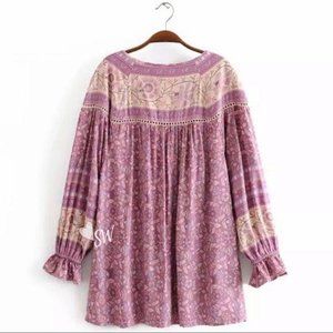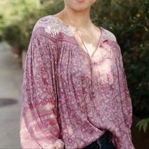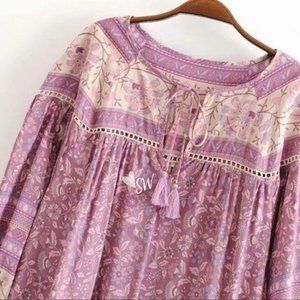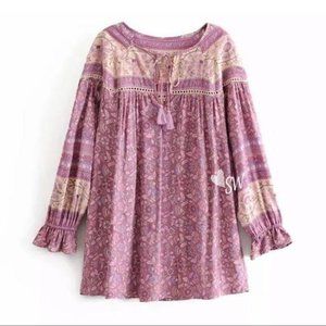 Long sleeve with elastic cuff and frill detail. tassel tie open neckline with crochet detail across chest and shoulder. Gorgeous boho print in cream & purple. Gypsy free people anthro lovers will delight!