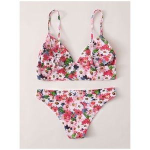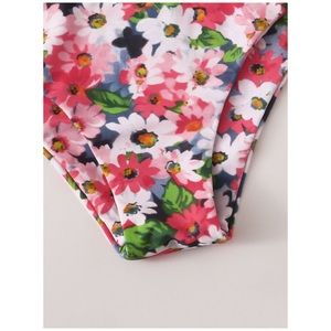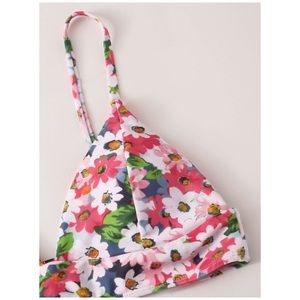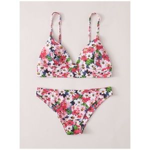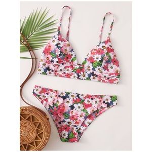 Colorful daisy printed triangle style two piece bikini swimsuit set with spaghetti style straps and removable padding.