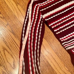 Hello! I am about to post more pics with the measurements! The length is 35 1/2 inches, shoulders 13 inches, sleeves 18 inches, waist 12 1/2 inches, and chest 15 inches. The fabric is stretchy since it is knit. Super flattering and fitted in the torso with a bit of drapey flare from the waist